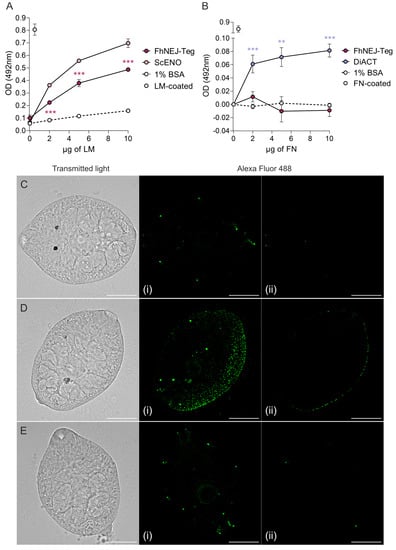 2.1. The FhNEJ Tegument-Enriched Protein Fraction (FhNEJ-Teg) Contains Proteins That Bind to LM but Not FN