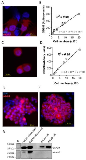 Confirmation of OVCA4-mKate2 and OVCA8-mKate2 cells. Confocal images of OVCA4-mKate2 (A) and OVCA8-mKate2 cells (C). Fluorescent curves of mKate2 protein in OVCA4-mKate2 cells (B) and OVCA8-mKate2 cells (D), derived by fluorescent values at 588 nm (y-axis) relative to cell numbers (x-axis); Values are pooled data and mean ± SD. Confocal images of spheroids of OVCA4-mKate2 (E) and OVCA8-mKate2 cells (F). The red color indicates mkate2 protein; the blue indicates DAPI staining indicative of nuclei. Scale bars show 20 µm in (A,B,E) and 50 µm in (F). Western blot of mKate2 protein (~27 kDa) and GAPDH (~37 kDa) in OVCA4-mKate2, OVCA8-mKate2 cells, OVCA4, and OVCA8 (G). GAPDH amount indicates the total protein of cell samples loaded. mKate2 protein, GAPDH, and molecular weight markers (M) as indicated.