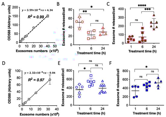 Quantification of exosomes released from transfected attached cells and spheroids of OVCA4 and OVCA8. The fluorescent curve of OVCA4-mKate2 exosomes (A) was derived by plotting fluorescent values of mKate2 protein at 588 nm (y-axis) against OVCA4-mKate2 exosome numbers (x-axis). Absolute amounts of exosomes released by a single OVCA4-mKate2 cell after incubation for 1, 6, and 24 h were detected using attached OVCA4-mKate2 cells (B) and OVCA4-mKate2 spheroids (C). The fluorescent curve of OVCA8-mKate2 exosomes (D) was derived by plotting fluorescent values of mKate2 protein at 588 nm (y-axis) against OVCA8-mKate2 exosome numbers (x-axis). Absolute amounts of exosomes released by a single OVCA8-mKate2 cell after incubation for 1, 6, and 24 h were detected using attached OVCA8-mKate2 cells (E) and OVCA8-mKate2 spheroids (F). Values are pooled data and mean ± SD. One-way ANOVA analysis, Holm-Sidak’s multiple post hoc test, p > 0.05: no significant difference (ns), p < 0.5: *, p <0.01: **, p < 0.001: ***, and p < 0.0001: ****.