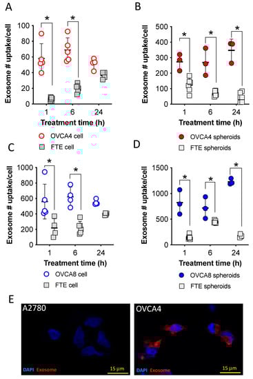 It is established that the tropism of tumor-derived exosomes for cancer cells could provide a potential drug-delivery system that specifically targets cancer cells with packaged drugs for enhanced cancer therapy []. This was demonstrated using cultured OVCA4 and OVCA8 cells, as well as FTE cells (non-cancer cells), which have been considered as possible origins of high-grade serous ovarian cancers [,]. To investigate whether OVCA4-mKate2 exosomes are specifically taken up by OVCA4 cells, both FTE and OVCA4 attached cells were treated with known amounts of OVCA4-mKate2 exosomes. The uptake of OVCA4-mKate2 exosomes by attached OVCA4 cells was ~9.7-fold higher than by attached FTE cells after 1 h treatment (Figure 4A). After 6 h treatment, OVCA4-mKate2 exosomes remained ~3.5-fold greater in attached OVCA4 cells than in attached FTE cells (Figure 4A). When OVCA4 and FTE spheroids were treated for 1, 6, or 24 h, OVCA4-mkate2 exosomes were ~2.2-fold, ~3.9-fold, and ~7.7-fold greater in OVCA4 spheroids than in FTE spheroids, respectively (Figure 4B). With respect to OVCA8-mkate2 exosomes, for attached cells after 1 h and 6 h treatments, exosome levels were ~2.6-fold and ~2.8-fold greater in attached OVCA8 cells than in attached FTE cells, respectively (Figure 4C). For OVCA8 and FTE spheroids, OVCA8-mKate2 exosome levels were also greater in OVCA8 spheroids than in FTE spheroids, with ~8.6-fold, ~3.3-fold, and ~2.4-fold differences, respectively, observed in the 1, 6, or 24 h treatment groups (Figure 4D).