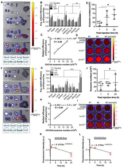Distribution and quantification of mKate2-exosomes in OVCA4 and OVCA8 tumor-bearing mice. (A) Representative fluorescent images of brain, heart, lung, spleen, kidney, muscle, tumor, and liver tissues excised from untreated OVCA4 tumor-bearing mice (Control) and OVCA4 tumor-bearing mice treated with OVCA4-mKate2 exosomes for 1, 6, or 24 h. (Fire bar: fluorescent intensity, yellow is strongest to dark red is minimum intensity). (B) Pooled data of average radiant efficiency of different tissues from untreated OVCA4 tumor-bearing mice (white rectangle) and OVCA4 tumor-bearing mice treated by OVCA4-mKate2 exosomes for 1 (light grey rectangle), 6 (dark grey rectangle), or 24 h (black rectangle). (C) Fluorescent curves of OVCA4-mKate2 exosomes detected using IVIS imaging system, derived by radiant efficiency at 603 nm (y-axis) relative to exosome numbers (x-axis). (D) Representative image of OVCA4-mKate2 exosomes detected using IVIS imaging System (n = 3 samples). (Fire bar: fluorescent intensity, yellow is strongest to dark red is minimum intensity). (E) Absolute amounts of the exosomes in OVCA4 tumor tissues after intravenous (IV) injection of OVCA4-mkate2 exosomes for 1, 6, or 24 h. (F) Fluorescent detection of OVCA8-mKate2 exosomes in brain, heart, lung, spleen, kidney, muscle, tumor, and liver tissues dissected from untreated OVCA8 tumor-bearing mice (Control) and OVCA8 tumor-bearing mice treated with OVCA8-mKate2 exosomes for 1, 6, or 24 h. (Fire bar: fluorescent intensity, yellow is strongest to dark red is minimum intensity). (G) Pooled data of average radiant efficiency of different tissues from untreated OVCA8 tumor-bearing mice (white rectangle) and OVCA8 tumor mice treated by OVCA8-mKate2 exosomes for 1 (light grey rectangle), 6 (dark grey rectangle), or 24 h (black rectangle). (H) Fluorescent curves of OVCA8-mKate2 exosomes detected using IVIS imaging System, derived by radiant efficiency at 603 nm (y-axis) relative to exosome numbers (x-axis). (I) Fluorescent image of OVCA8-mKate2 exosomes detected using IVIS imaging system (n = 3 samples). (Fire bar: fluorescent intensity, yellow is strongest to dark red is minimum intensity). (J) Absolute amounts of OVCA8-mKate2 exosomes in OVCA8 tumor tissues after intravenous (IV) injection of OVCA8-mKate2 exosomes for 1, 6, or 24 h. (K,L) Determination of the pharmacokinetic profile of exosomes by measuring the exosome intensity in the blood. Values are pooled data and mean ± SD (B,C,E,G,H,J). Two-way ANOVA analysis, Holm-Sidak’s multiple post hoc test, p > 0.05: no significant difference, p < 0.5: *, p < 0.01: **, and p < 0.001: ***. (B,G). One-way ANOVA analysis, Holm-Sidak’s multiple post hoc test, p > 0.05: no significant difference, p < 0.5: *, p < 0.01: **, and p < 0.001: ***. (E,J).