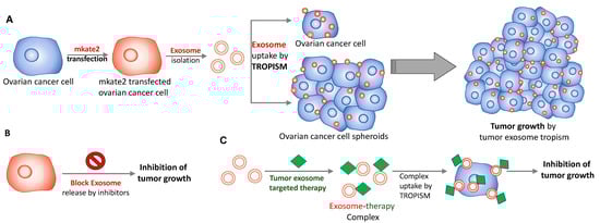 Diagram of cancer therapeutic application using tumor-derived exosome tropism. (A) Ovarian cancer cells secrete exosomes to the extracellular matrix or culture media. These fluorescent exosomes can home to their parental ovarian cancer cells or to 3D spheroids through cancer cell exosome tropism, which promotes tumor growth. (B) Thus, inhibition of tumor exosome release by the exosome inhibitors could suppress tumor growth prevented by tumor exosome tropism. (C) Additionally, potentially, tumor exosome-targeted therapies (green diamond, e.g., exosome-targeted drug delivery systems) could form exosome-therapy complexes, and they are inclined to home to parent cancer cells through tropism and deliver a significant number of therapies to the tumor. Then, finally, it causes to inhibit tumor growth. Thus, a tumor exosome-targeted therapeutic system could be another avenue of drug delivery system as a cancer therapy.