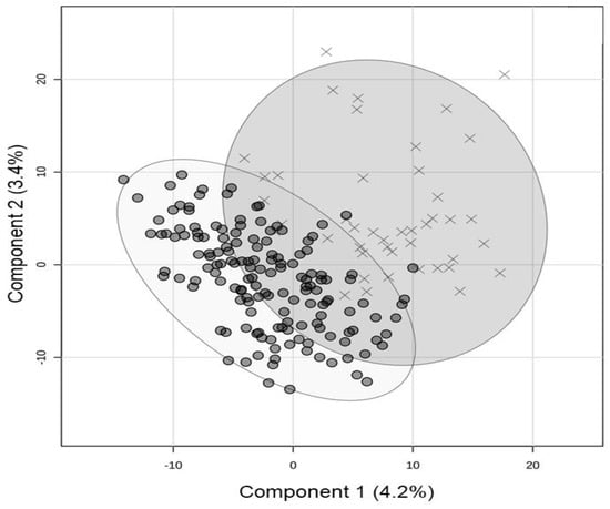 Salivary miRNA profiles in children with severe versus non-severe SARS-CoV2 illness. The two-dimensional partial least squares discriminant analysis (PLSDA) plot displays total saliva miRNA profiles for severe (X’s; n = 45) and non-severe (O’s, n = 152) cases of SARS-CoV-2, as measured with RNA sequencing. The 95% confidence intervals are shown with ovals. There was moderate separation of the two groups based on expression levels of 1606 miRNAs. However, this plot accounts for only 7.6% of the variance in miRNA data, as only 43 miRNAs displayed a significant difference between groups (defined as adjusted p < 0.05 and fold change > 2 on Wilcoxon Rank testing).
