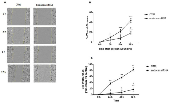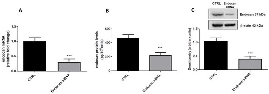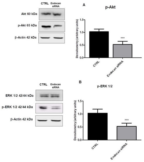 2.4. Endocan Silencing Decreased AKT and ERK1/2 Activation