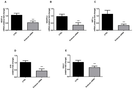 2.2. Endocan Silencing Affects VEGF-A, VEGFR-2, HIF-1α, and Long Non-Coding RNAs H19 and HULC Expression in A549 Cells