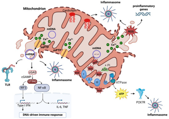 Although the original sources of DAMPs comprise also plasma membrane (PM) and nuclear and intracellular proteins, it has been discovered that mitochondrial components, including mtDNA, mitochondrial ROS, ATP, cardiolipin (CL), and Ca2+, play a key role to drive inflammation, acting as mtDAMPs (Figure 1) [22,23]. Consistent with the importance of mitochondrial health, several mechanisms, such as MOM permeabilization, mitochondrial permeability transition pore (mPTP) opening, or vesiculation, control the release of mtDAMPs contributing to maintain the mitochondrial quality control. An integrated coordination of mechanisms operates to limit mitochondrial stress by monitoring mitochondrial damage and providing the selective removal of dysfunctional mitochondrial proteins or parts of organelle by mitophagy [24,25].