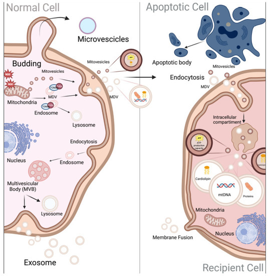 Indeed, cells need to transfer information with each other to coordinate cellular growth and cellular development and to promote their environmental adaptation and function. This intercellular communication may be performed by direct contact between cells or by the release of EVs. The mitochondrial-derived vesicles (MDVs) and mitovesicles are novel subpopulations of EVs of mitochondrial origin; they differ in morphology, size, and content from canonical EV subtypes [18,19]. The levels and cargo of MDVs and mitovesicles may be altered when mitochondrial dysfunction occurs, modulating the metabolic and inflammatory responses of recipient cells [20,21]. The control of MDVs and mitovesicles biogenesis and release might be interesting in view of a possible modulation of inflammation. This could shed a new light in the study of mitochondrial homeostasis and on how its loss, with the consequent release of MDVs and mitovesicles, is linked to the development of various pathologies. In this review, we will discuss the role of EVs in trafficking mitochondrial cargoes during inflammation in several diseases, such as in pulmonary and cardiovascular diseases, neurodegenerative pathologies, and cancer.