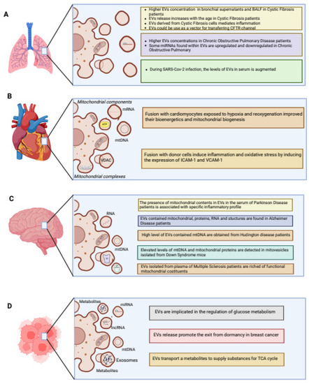 Extracellular vesicles (EVs) release in inflammatory-related diseases. (A) In the pulmonary system of cystic fibrosis patients, the released EVs are higher respect to control, and this EV release increases with age of cystic fibrosis patients. In Chronic Obstructive Pulmonary Disease (COPD) patients, a higher release of EVs containing miRNAs is observed. In SARS-CoV-2 infection, patients showed an increased EVs release. (B) In the cardiovascular system, the EVs are enriched with mRNA, ATP, and mtDNA. The EVs incorporation in cardiomyocytes improved mitochondrial biogenesis during hypoxia and subsequent reoxygenation condition. EVs enriched with VDAC protein and fused with donor cells induced oxidative stress and inflammation by the expression of ICAM-1 and VCAM-1. (C) In the nervous system, EVs are involved in different diseases. An increased level of released EVs, containing mtROS, was observed in Parkinson Disease (PD). EVs containing RNA are higher in Alzheimer Disease (AD) patients respect to control. EVs containing mtDNA are increased in Huntington’s disease (HD) and Down Syndrome patients. an increased level of EVs containing a higher mitochondrial complex IV and a lower mitochondrial complex V activity was observed in Multiple Sclerosis (MS). (D) In cancers, Evs enriched in miRNAs, metabolites, and lncRNA regulated glucose metabolism. EVs containing mtDNA promoted the exit of breast cancer cells from dormancy. EVs enriched in metabolites supplied substances for TCA cycle. Created with BioRender.com.