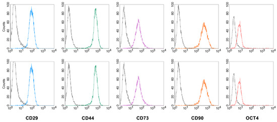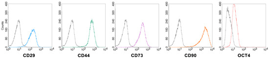 To further characterize the isolated MSCs, the expression of specific surface markers was assessed by flow cytometry (Figure 2). The cells expressed the surface antigens CD29, CD44, CD73 and CD90 (100% positive cells for all markers), indicating that these cells were of the mesenchymal lineage. The intracellular expression of OCT4, a regulatory transcription factor involved in the maintaining of stem cell renewal capacity and the undifferentiated state of embryonic and adult stem cells, was also confirmed (positive cells > 80%).