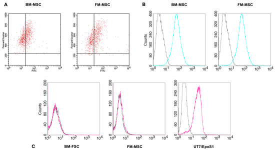 Immunophenotype of BM-MSCs (top) and FM-MSCs (bottom). Selected mesenchymal markers were analyzed by flow cytometry. Black line: control; colored line: specific antibody.