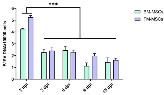 Amounts of B19V DNA in BM-MSCs and FM-MSCs. MSCs were infected with B19V at the multiplicity of 104 geq/cell. The amount of B19V DNA was determined by qPCR at different times post-infection and expressed as B19V genome copies/10,000 cells. Columns indicate the mean values obtained from three independent experiments, bars are the standard error of means. Statistical analysis was performed by a Tukey’s multiple comparison test (***, p < 0.001).