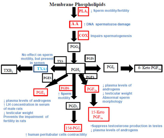 In a Swedish study, it was revealed that 19-hydroxy PGF and 19-hydroxy PGE have a significant role in sperm motility, potentially through the ATP content in spermatozoa [57]. 15-deoxy-Δ12-14-PGJ2, a product of COX/PGD synthase, could be involved in human sub-/infertility by affecting the human peritubular cells contractility and phenotype potentially through ROS [58].