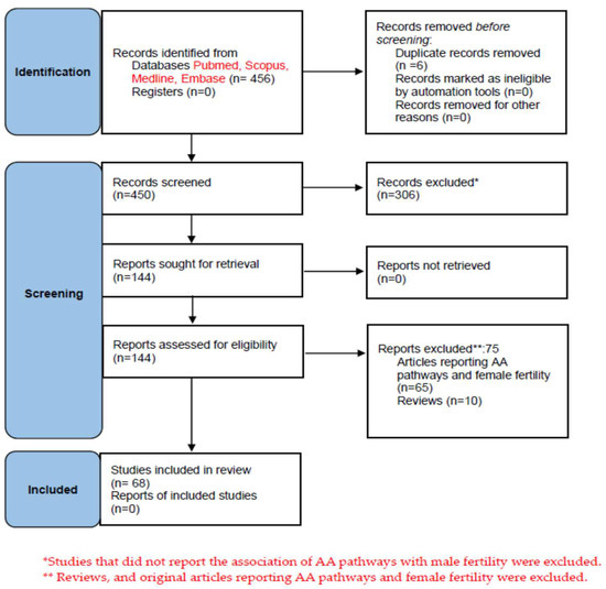 Duplicates articles, studies that did not report the association of AA pathways with male fertility, reviews, and original articles reporting AA pathways and female fertility were excluded.
