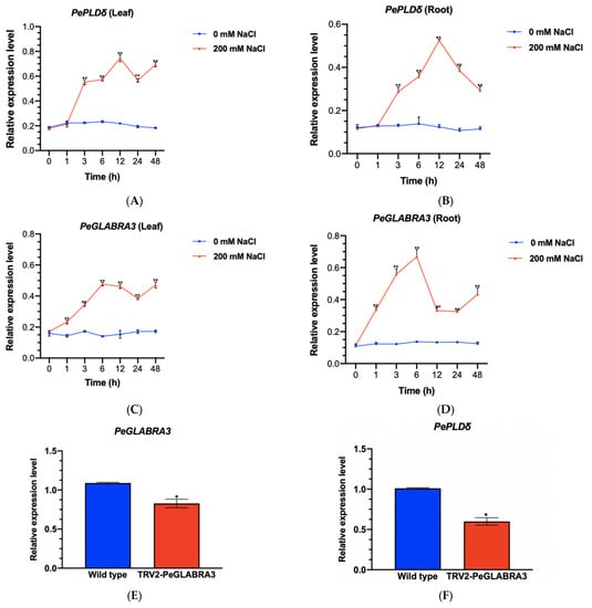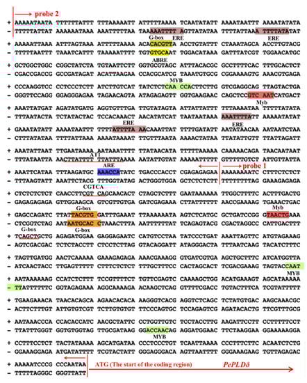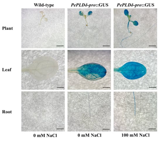 2.3. NaCl Activates the PePLDδ Promoter in Root and Leaf Tissues