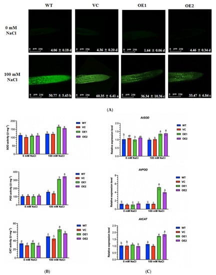 2.9. PeGLABRA3-Transgenic Plants Increased ROS Scavenging Capacity under Salt Stress