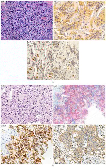 Histologic and immunohistochemical staining of primary tumor (A) and metastasis (B) of patient. (A) H&E, hematoxylin-eosin staining; NSE, positive IHC staining of neuron-specific enolase; Ki-67 staining of about 4% of nuclei. (B) H&E, hematoxylin-eosin staining; Syn, diffuse IHC staining of synaptophysin; ChrA, diffuse IHC staining of chromogranin A; SDHB, positive IHC staining of succinate dehydrogenase subunit B. Original magnification: 40×.
