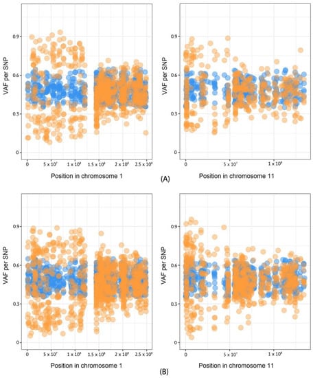 Deletion of chromosome 1p and 11p in primary tumor and metastasis of patient. (A) VAF of heterozygous SNPs in primary tumor, (B) VAF of heterozygous SNPs in metastasis. Orange dots indicate SNPs in tumor tissue; blue dots mark SNPs in matched norm.