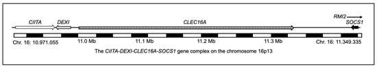 Schematic depicting the chromosome16p13 genetic region comprising CIITA (Class II Major Histocompatibility Complex Transactivator), DEXI (homolog, cytotoxic suppression), CLEC16A (C-type lectin domain family 16, member A), SOCS1 (Suppressor of Cytokine Signaling 1), and RMI2 (RecQ Mediated Genome Instability 2). (Genome Reference Consortium Human Build 38 (GRCh38), chromosome 16: 10.971.055–11.349.335).