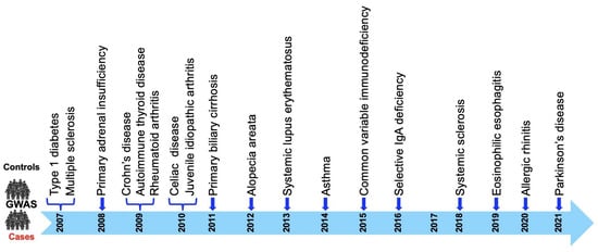 The CLEC16A locus is now associated with the susceptibility to 18 autoimmune diseases (Figure 2) depicted in a timeline through GWAS and meta-analysis, including type1 diabetes (T1D) [,,,,,,,,,,,,,], multiple sclerosis (MS) [,,,,,,,,,,,,,,,,], primary adrenal insufficiency (PAI) [,], systemic lupus erythematosus (SLE) [,,,], Crohn’s disease (CD) [], selective immunoglobulin A deficiency (IgA) [], alopecia areata (AA) [,], juvenile idiopathic arthritis (JIA) [], rheumatoid arthritis (RA) [,], primary biliary cirrhosis (PBC) [,,,], asthma [,,,,,,], allergic rhinitis (AR) [,], autoimmune thyroid diseases (ATD) [,], common variable immunodeficiency (CVID) [], eosinophilic esophagitis (EE) [], juvenile idiopathic arthritis (JIA) [], selective IgA deficiency [], Celiac disease [], systemic sclerosis [], and Parkinson’s disease (PD) [,].