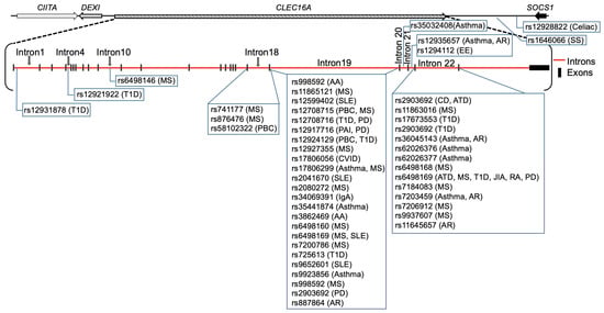 The 18 autoimmune disease-associated single nucleotide polymorphisms (SNPs) and their localization are depicted on the 238 kb CLEC16A gene. The chromosome 16p13.13 locus ~530 kb long region is the house of four genes (CIITA-DEXI-CLEC16A-SOCS1). CLEC16A is flanked by two neighboring genes: CIITA, which is required for the expression of MHC Class II, and SOCS1, a negative modulator of cytokine signaling. Primary adrenal insufficiency (PAI), allergic rhinitis (AR), alopecia areata (AA), asthma, autoimmune thyroid diseases (ATD), Celiac disease, common variable immunodeficiency (CVID), Crohn’s disease (CD), eosinophilic esophagitis (EE), juvenile idiopathic arthritis (JIA), multiple sclerosis (MS), Parkinson’s disease (PD), primary biliary cirrhosis (PBC), rheumatoid arthritis (RA), selective IgA deficiency, systemic lupus erythematosus (SLE), systemic sclerosis, and type 1 diabetes (T1D).