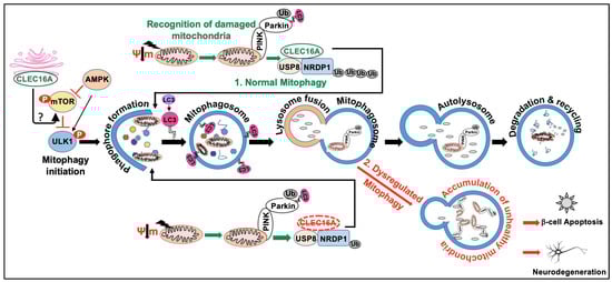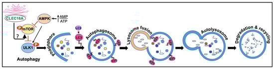 CLEC16A has been found to play a role in the regulation of autophagy, an evolutionarily conserved process by which cells break down and recycle damaged or dysfunctional cellular components []. Autophagy is important for maintaining cellular homeostasis, and dysregulation of this process has been implicated in various diseases, including neurodegeneration, cancer, metabolic disorders, and autoimmunity [,,]. Based on degraded cell components, some selective types of autophagy identified are mitophagy, ribophagy, reticulophagy, lysophagy, pexophagy, lipophagy, and glycophagy []. The regulation of autophagy is intricate and depends on several factors such as nutrient availability, cellular stress, energy status, a complex network of signaling pathways, and cellular factors. One of the primary negative regulators of autophagy is the mammalian target of the rapamycin (mTOR) signaling pathway. The activation of mTORC1 is triggered by various stimuli, including those mediated by growth factors, nutrients, and amino acids, as well as tuberous sclerosis complex 1/2-dependent and independent mechanisms [,,]. The activity of mTOR is closely linked to fundamental cellular processes, including cell proliferation, differentiation, apoptosis, and autophagy. The understanding of the molecular mechanism that regulates the different phases of the autophagic process and its role in the development of diseases is still being explored.
