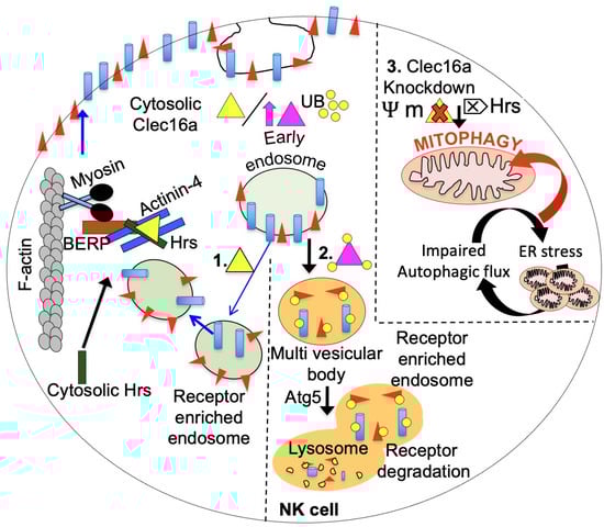 The multifaceted role of CLEC16A in receptor recycling in NK cells is illustrated in a schematic diagram, emphasizing the delicate balance required for NK cell function and homeostasis. The amount of CLEC16A protein is critical for maintaining this balance, as illustrated. In the left panel (1), the normal level of endogenous CLEC16A (yellow triangle) is shown to regulate receptor trafficking by participating in endosome recycling. CLEC16A binds to the Hrs/Actinin-4/BERP/Myosin V (CART) complex, facilitating the transport of receptor-enriched endosomes to the cell surface membrane. The amount of CLEC16A protein serves as a checkpoint for NK cells. Overexpression of CLEC16A (purple triangle, middle panel, 2) leads to its own ubiquitination, resulting in increased association with the CART complex, thereby disrupting efficient receptor recycling. Consequently, receptors are targeted for degradation through autophagy, leading to attenuated receptor signaling. Loss of CLEC16A (right panel, 3) leads to disrupted mitophagy and the accumulation of unhealthy mitochondria. CLEC16A stabilizes and prevents the proteasomal degradation of Nrdp1, which limits the recruitment of Parkin to the mitochondrial surface and promotes autophagosome-lysosome fusion during the late stages of mitophagy.