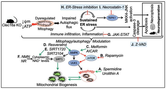 Figure 7 depicts various drug targets to address the consequences of CLEC16A hypofunction, aimed at restoring cell homeostasis in response to mitochondrial dysfunction. (A) Natural compounds such as spermidine [,,] and Urolithin-A an ellagitannins-derived metabolite have been shown to induce muscular mitophagy in cultured cells and C. elegans [,] and neuronal mitophagy in both C. elegans and the mouse brain [,]. (B) mTOR signaling with Rapamycin to stimulate mitophagy through AMPK and ULK1 activation [,,,,,]. (C) Supplementing with AICAR [,] and Metformin [,,,], an oral FDA-approved antidiabetic drug, can activate the enzymatic activity of AMPK, leading to ULK1 phosphorylation and activation. This, in turn, promotes autophagy initiation and the removal of damaged mitochondria. Additionally, AMPK-mediated activation of PGC-1α supports the promotion of mitochondrial biogenesis. The AMPK signaling pathway is a crucial regulator of cellular energy metabolism and has been demonstrated to induce autophagy and enhance mitochondrial function. (D, E, and F) Resveratrol (a polyphenolic compound, mainly found in red grapes skin, with beneficial properties for organismal homeostasis) [,], several synthetic drugs such as SIRT1720 and SIRT2104, and NAD+ suppliers indirectly enhance SIRT1 activity through AMPK activation, which raises cytoplasmic NAD+ levels and autophagy [,,,]. (G) Inflammation and cytokine signaling through SOCS-mediated JAK-STAT inhibitors. (H) Loss of CLEC16A leads to a vicious cycle of autophagic/mitophagy impairment and ER stress. Pharmacological inhibition of ER stress by any one of the three branches of unfolded protein response (UPR) namely Inositol Requiring 1 (IRE1), PKR-like ER kinase (PERK), and Activating Transcription Factor 6 (ATF6) could be beneficial. (I) Necrostatin-1 (Nec-1) is a potent and specific small-molecule inhibitor of receptor-interacting serine/threonine-protein kinase 1 (RIPK1). RIPK1, through its kinase and scaffolding functions, is a key regulator of apoptosis, necroptosis, and inflammatory pathways [,]. (J) The compound z-VAD-FMK (zVAD) is a cell-permeant pan-caspase inhibitor that irreversibly binds to the catalytic site of caspase proteases and can inhibit the induction of apoptosis [].