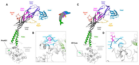 Molecular models of the mouse P2X7 subunits with amino acid residue Pro451 or 451Leu. (A–D) The full-length mouse P2X7 subunit (NCBI) was modeled with the I-TASSER protein structure prediction suite [142,143] using the cryo-electron microscopy structure of rat P2X7, PDB ID: 6u9v [84] as a template. Sections of the P2X7 subunits are colored as depicted by the dolphin-like structure (inset) of the P2X4 subunit [144], including the head (blue), upper body (violet), right (magenta) and left (yellow) flippers, dorsal fin (red), lower body (gray), transmembrane domain-spanning fluke (green), and the intracellular ballast domain (not shown on inset; white). Boxed areas indicate the region containing the Pro451Leu SNP. (A) Modeling of P2X7-Pro451 returned a C-score of 0.25 with an estimated TM-score of 0.75 ± 0.11 and root mean square deviation of 7.1 ± 4.2 Å. (B) Close-up images of boxed areas, with Pro451 shown as ball and stick structures (magenta). Amino acid residues within 5 Å of the residue of interest are also labeled (cyan). (C) Modeling of P2X7-451Leu returned a C-score of 0.20 with an estimated TM-score of 0.74 ± 0.11 and root mean square deviation of 7.2 ± 4.2 Å. (D) Close-up images of boxed areas, with Leu451 shown as ball and stick structures (magenta). Amino acid residues within 5 Å of the residue of interest are also labeled (cyan). Images were produced using Mol* [145]. Figure created in BioRender.com with permission.