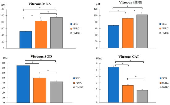 VIT pro-oxidant molecules (MDA and 4HNE), and antioxidant enzymes (SOD and CAT) in the study participants. Values are mean ± SD. * p < 0.001. VIT: vitreous; MDA: malondialdehyde (µM); 4HNE: 4-hydroxynonenal; SOD: superoxide dismutase; CAT: catalase. SCG: surrogate control group; PDRG: proliferative diabetic retinopathy group; DME: diabetic macular edema group.