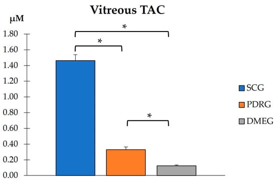 VIT total antioxidant capacity in the study participants. * p < 0.001. VIT: vitreous; TAC: total antioxidant capacity; SCG: surrogate control group; PDRG: proliferative diabetic retinopathy group; DMEG: diabetic macular edema group.