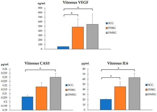 VIT levels of the pro-inflammatory IL6, pro-angiogenic VEGF, and pro-apoptotic CAS3 of the study participants. * p < 0.001. VIT: vitreous; IL6: interleukin 6 (pg/mL); VEGF: vascular endothelial growth factor (ng/mL); CAS3: caspase 3 (pg/mL). PDRG: proliferative diabetic retinopathy group; DMEG: diabetic macular edema group; SCG: surrogate control group.