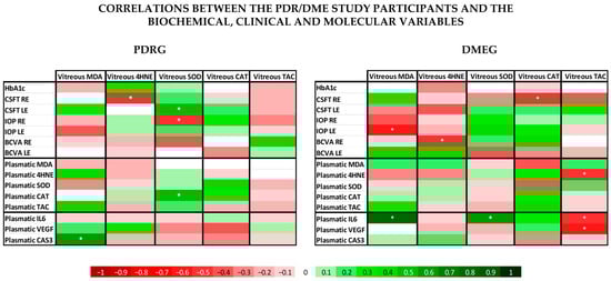 When comparing the ophthalmological variables with the same pro-oxidant and antioxidant parameters (MDA; HNE, SOD, CAT, TAC) in the PDR group, we saw a significant positive correlation between CSFT in the LE and the VIT-SOD levels (rho = 0.5; p < 0.01), and a significant negative correlation between CSFT in the RE and the VIT-4HNE, as well as the IOP in the LE and the VIT-SOD (rho = −0.5; p < 0.01). In the DME group the analysis showed a negative correlation between CSFT in the RE and the VIT-CAT, the IOP in the LE and VIT-MDA, and the BCVA in the LE and the VIT-4HNE (rho = −0.5; p < 0.01).