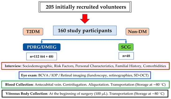 Finally, a total of 160 volunteers (112 T2DM with PDR/DME and 48 from the CG) were eligible for the study, verbally informed by the ophthalmologist, and signed the consent form. The screening procedures for the recruitment and appointment schedules of the study participants are reflected in the flowchart (Figure 8).