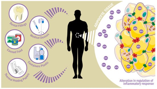 BPA exposure through food, inhalation, dental materials, or dermal exposure. Once it enters the body, it can alter the physiology of adipose tissue by modifying inflammatory pathways.