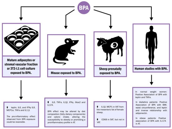 BPA is a common disruptor and, due to its ubiquitous nature and potential for continued exposure, is detectable in a wide range of body fluids, such as plasma, urine, saliva, breast milk, and amniotic fluid. The dramatic upsurge in the prevalence of obesity has occurred in parallel with an excessive increase in the use of plastic and other products containing endocrine disruptors. Because of their complex interaction with hormone receptors, endocrine disruptor mechanisms of action in the body are difficult to understand. However, in recent years, there has been a growth in experimental research associating BPA exposure to the pathophysiology of obesity, dysregulation of insulin and glucose signaling, and type 2 diabetes mellitus. This relationship is supported by results demonstrating an association between BPA exposure at different doses and increased body weight, alterations in adipokine production, and glucose homeostatic imbalance. It is also clear that this type of disease is related to proinflammatory processes, which aggravate its pathogenesis and prognosis. Interestingly, scientific evidence has begun to show that there is a relationship between BPA exposure and proinflammatory processes in adipose tissue (Figure 3). Nevertheless, the precise role BPA plays as an immunomodulator remains to be elucidated. Moreover, several aspects, such as sex, dose, exposure time, and even the type of response the adipose tissue anatomical compartment might elicit, remain to be clarified. Therefore, further investigations are necessary to gain a more comprehensive view on the association between BPA and inflammation, thus, discerning the possible underlying mechanisms.