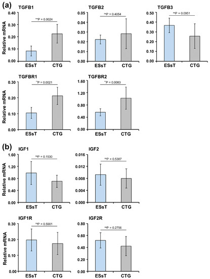 Compared to the low expression (Ct > 28) of genes encoding isoforms of FGF and BMP (Supplementary Material, Figure S1) and their respective receptors, IGF1 (encoding the IGF-1 isoform) was the only transcript expressed at considerably high levels (Ct = 20–21) in both ESsT and CTG, despite the not significant difference in its expression between the two tissue types (Figure 2b). The IGF2, encoding the IGF-2 isoform, as well as the IGF1R and IGF2R, encoding two receptors for the IGF ligands, showed lower and not significantly different expression in the two tissue types (Figure 2b).