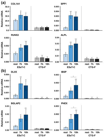 Next, the effect of intermittent equibiaxial cyclic strain on the osteogenic marker gene expression in primary ESsT-Cs and CTG-Fs was investigated (Figure 4). Interestingly, primary ESsT-Cs exhibited preserved osteogenic potential both under basal conditions (rest) and under mechanical stimulation (7- and 10-h loading cycles) versus no osteogenesis in primary CTG-Fs under both conditions. Moreover, cyclic strain (both regimens) significantly upregulated the expression of both pre-osteoblast (Figure 4a) and osteoblast (Figure 4b) differentiation markers. A gradual increase, dependent on the duration of the cyclic strain application, was detected for most of the transcripts, including RUNX2, ALPL, IBSP, BGLAP2, and PHEX (Figure 4a,b). The strain-induced upregulation of two of the mature osteoblast markers, namely IBSP and PHEX, was significantly better pronounced with the 10-h compared to the 7-h regimen (Figure 4b). In contrast, in primary CTG-Fs, cyclic mechanical strain had no influence on the osteogenic gene expression and, interestingly, it caused a clear suppression of DLX5 and IBSP transcripts compared to resting cells.