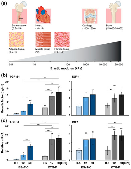 Finally, the analyses of TGFB1 and IGF1 mRNA levels in ESsT-C and CTG-F cells cultured on 0.5, 12, and 50 kPa matrices fully reflected the results obtained at a protein level (Figure 5c).
