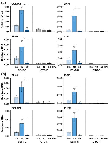 Next, osteogenic marker gene expression was investigated in primary ESsT-Cs and CTG-Fs grown on matrices with different stiffnesses (Figure 6). The primary ESsT-Cs grown on 0.5 and 12 kPa matrices exhibited preserved osteogenic potential versus no osteogenesis detected in primary CTG-Fs under both conditions. Both pre-osteoblast (Figure 6a) and osteoblast (Figure 6b) differentiation markers were extremely significantly upregulated by 2.7–9.0–fold in ESsT-Cs grown on 12 compared to the cells grown on 0.5 kPa matrices. Interestingly, all osteoblast differentiation markers, except for SPP1, were significantly (p < 0.05) downregulated by 3.1–8.5-fold in ESsT-Cs cultured on 50 kPa compared to 0.5 kPa matrices. Similar to the effect of cyclic mechanical strain, the matrix stiffness in primary CTG-Fs had no influence on the osteogenic gene expression. Moreover, in most cases, a gradual inhibition, significant in the case of DLX5 and IBSP mRNA levels, was observed in the CTG-Fs grown on 12 and 50 kPa matrices compared to cells grown on compliant matrices (Figure 6b).