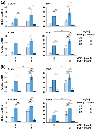 Our data showed that 1 ng/mL of rTGF-β1 (equal to 2 ng/mL of tTGF-β1) applied either in the absence of rIGF-1 (equal to 1 ng/mL of tIGF-1) or the presence of 1 ng/mL of rIGF-1 (equal to 2 ng/mL of tIGF-1) caused a significant increase in COL1A1, SPP1, RUNX2, ALPL, DLX5, IBSP, BGLAP2, and PHEX mRNAs compared to the respective expression levels in cells not receiving recombinant growth factors exogenously, from here on referred to as untreated cells (Figure 7a,b). Similar to the effect seen in ESsT-Cs grown on stiff 50 kPa matrices (cf. Figure 6), 5 ng/mL of rTGF-β1 (equal to 6 ng/mL of tTGF-β1) applied in the presence of IGF-1 as indicated above caused a strong suppression of the osteogenic gene expression. In the case of late differentiation markers such as IBSP, BGLAP2, and PHEX, the suppression appeared significant compared to their expression levels in untreated cells (Figure 7b). Except for the expression of genes encoding the bone matrix proteins collagen type 1 and osteopontin (Figure 7a), the application of 1 ng/mL of rIGF-1 (equal to 2 ng/mL of tIGF-1) in the absence of rTGF-β1 (equal to 1 ng/mL of tTGF-β1) caused an extremely significant upregulation of all osteoblast-specific mRNAs above the expression levels seen in untreated cells (Figure 7). Furthermore, in the presence of 2 ng/mL of tIGF-1, 2 ng/mL of tTGF-β1 significantly potentiated the osteogenic gene expression compared to 1 ng/mL of tTGF-β1, which supported the dose-dependent and synergistic activity of TGF-β1. In the presence of 2 ng/mL of tTGF-β1, except for SPP1 and BGLAP2 mRNAs, all other osteogenic transcripts were significantly better induced by 2 ng/mL of tIGF-1 compared to 1 ng/mL of tIGF-1, which further supported a mutual synergism between the two growth factors in triggering the osteogenic potential of ESsT-Cs.
