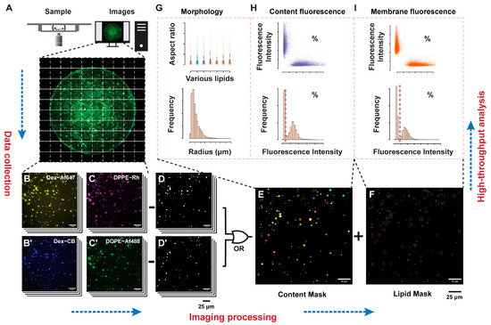 Schematic representation of the analysis workflow. Large image acquisition of the GUV samples in an imaging chamber (A) composed of multiple fluorescence channels related to content markers (B,B’), or lipid markers (C,C’), are acquired. Filtering (D,D’) and thresholding generates labelled content (E) and lipid (F) images, used to extract the morphological (G), content fluorescence (H), and membrane fluorescence (I) distributions that can be thresholded (dashed lines) to define the positive and negative GUV populations for each parameter.