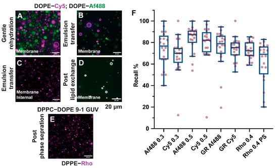 Recall analysis for heterogeneous GUVs. Object recall for a variety of GUVs preparations was evaluated. Samples prepared by gentle rehydration, containing two different fluorophores and multilamellar or multivesicular vesicles, (A) showed highly variable recall scores (boxplot F, label GR Af488, and GR Cy5). GUVs prepared by emulsion transfer with DOPE–Cy5 and DOPE-Af488 ((B) on separate populations at 0.6%, (D) on the same vesicles but at 0.3% concentration) and DPPE–Rh ((C) at 0.4%) can contain oil inclusion, and show a more consistent recall score, with values proportional to the amount of fluorescent lipids used ((F) boxplots labelled as Af4880.3, Cy5 0.3, Af488 0.6, Cy5 0.6, and Rho 0.4). Phase segregation in bilayers can lead to uneven fluorescence distributions in the membranes, as depicted in (E) for the DPPC–DOPE 9-1 GUV stained with 0.4% DPPE-Rh. This affects recall, making it more variable on an image-to-image basis ((F) boxplot label Rho 0.4 PS).