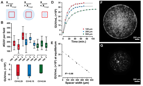 Imaging setup optimization. By varying the ratio of imaged area to sample area (A), the field-to-field variability of detected GUVs can be minimized (B), leading to more accurate GUV concentration estimates (by the coefficient of variation CV in (C)). Imaging of GUVs during their sedimentation shows faster equilibration in thinner imaging chambers ((D), where the dots represent the measurements and the lines represent asymptotic exponential fits), with linear dependency of the equilibrium concentration on the spacer width ((E), dots fitted values for growth limit in (D), dashed line linear fit with R2 = 0.98). Sample evaporation affects the distribution of GUVs over the imaged surface, as shown in the imaging chamber filled with air (F), or a fluorinated oil (G).