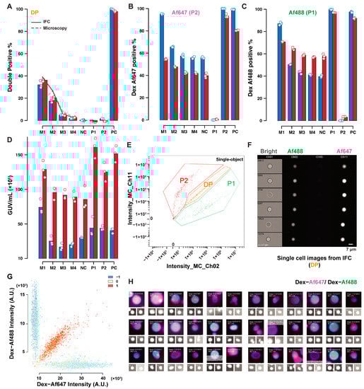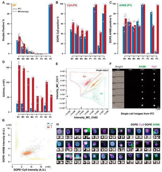 Comparison of IFC and microscopy analysis of the lipid exchange controls. Comparative results for percent estimates of DP GUVs (A), DOPE–Cy5 positive (B), DOPE–Af488 positive (C), and concentration estimate (D) obtained by microscopy (red), and IFC (blue). Datasets contained triplicate readings of P1 (DOPE–Af488 positive); P2 (DOPE-Cy5 positive); PC (containing both DOPE–Af488 and DOPE–Cy5); and NC (P1 and P2 1:1); and mixed samples of P1:P2:PC named M1 (1:1:1); M2 (1:1:0.5); M3 (1:1:0.1); and M4 (1:1:0.05). The solid line in (A) represents the expected double-positive percentage based on the GUVs concentration estimates from IFC, while the dashed line represents the same quantities using microscopy-based concentration estimates. An example of a fluorescence dot plot for a mixed sample is depicted in (E) (IFC, with an extracted sample of double-positive GUVs in (F)) and (G) (microscopy, with color representing the correlation score). Selected objects within a population can be displayed in panels composed of the merged image with its single channel representations below, as shown for DP GUVs in (H)).