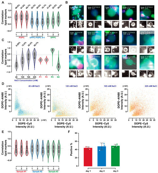 Characterization of lipid exchange in phosphatidylcholine GUVs is shown in Figure 6. Lipid transfer was more frequent in POPC GUVs compared to DPPC or DPPC–POPC 9-1 GUVs when incubated at room temperature overnight (after mixing at 55 °C and then cooling to 25 °C at 0.5 °C/min, in 225 mM sodium chloride, Figure 6A). GUVs above the correlation threshold are shown in Figure 6B, highlighting the impact of GUVs aggregation in lipid exchange detection. GUVs may be considered positive if the isolated objects can present both lipid markers, or if the neighbouring positive GUVs can push the score of the GUVs of interest above the threshold despite it being negative itself. This potential double counting does not prevent reliable quantification in the control experiments, as discussed in the previous section. Part of the signal detected as lipid exchange may still be due to aggregation, so its quantification requires better GUVs-GUVs separation, or better optical sectioning. Figure 6C shows the shift in correlation distribution with increasing sodium chloride concentration in POPC GUVs, paired with the change in fluorescence distribution with the mixing of the two fluorophores signals in Figure 6D. The reproducibility of lipid exchange by these means was evaluated by repeating the experiment in triplicate on three different days. The emulsion transfer method can have large batch-to-batch variabilities, making reproducibility assessments even more critical in GUVs studies. Figure 6E allows the comparison of correlation distributions over the triplicate experiments performed over three days, highlighting their similarity. The percentage of GUVs above the correlation threshold did not vary in the three replicates, as shown in Figure 6F (with no statistically significant differences having been detected by the analysis of variance).
