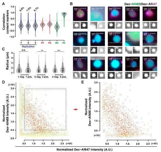 Content exchange upon sodium chloride incubation. (A) Content exchange between MPPC–DOPE 9-1 GUVs as indicated by shift in correlation; PC and NC refer to the positive and negative controls as described previously. Percentages of objects above the correlation threshold are reported as 6.9%, 7.5%, and 8.7%, respectively. (B) Extracted images of positive GUVs. The radius of the positive GUVs was slightly larger than the rest of the population in two of the three samples assessed (C). Positive GUVs had negatively correlated fluorescence signals, (D,E) indicating dilution of fluorescent probes upon exchange.