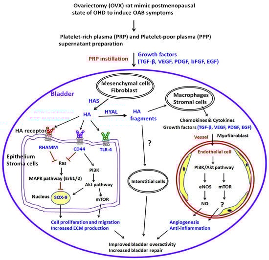 Lu, J.-H.; Chueh, K.-S.; Juan, T.-J.; Mao, J.-W.; Lin, R.-J.; Lee, Y.-C.; Shen, M.-C.; Sun, T.-W.; Lin, H.-Y.; Juan, Y.-S. Effects of Therapeutic Platelet-Rich Plasma on Overactive Bladder via Modulating Hyaluronan Synthesis in Ovariectomized Rat. Int. J. Mol. Sci. 2023, 24, 8242. https://doi.org/10.3390/ijms24098242