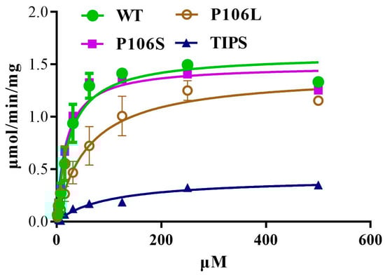 | Pro106Leu | 1.41 | 59.2 (13.8) | 1254.0 | 31.3 | 3.5 × 10−2 | 3.5 × 10−2 | 2.8 × 10−5 | 1.1 × 10−3 | 39.9 |