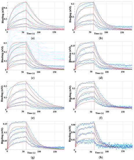 - Abdiche, Y.; Malashock, D.; Pinkerton, A.; Pons, J. Determining kinetics and affinities of protein interactions using a parallel real-time label-free biosensor, the Octet. Anal. Biochem. 2008, 377, 209–217. [Google Scholar] [CrossRef]