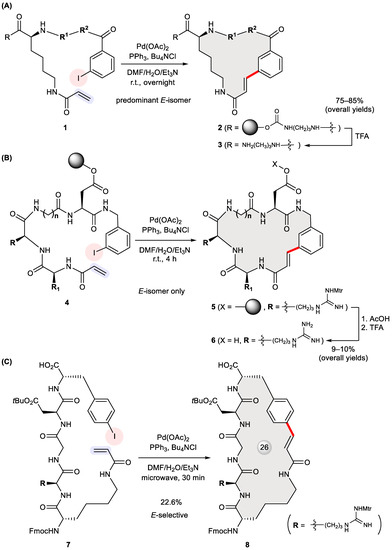 Synthesis of cyclic peptides 10 (A), 12 (B), 14a–14e and 16a–16e (C) via Heck cyclization.